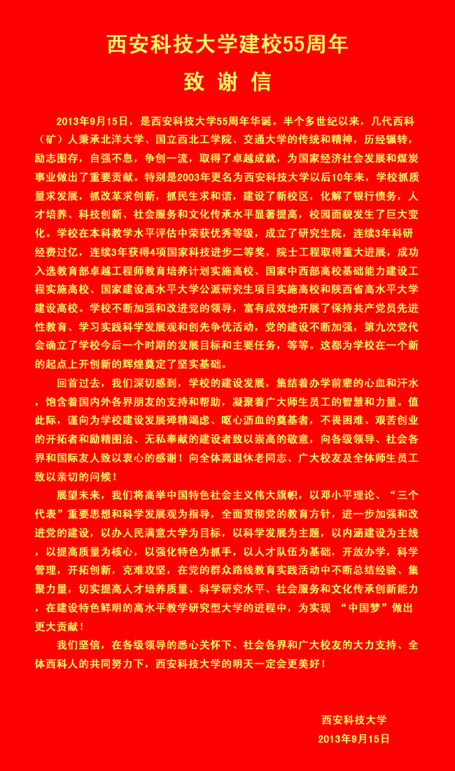 西安科技大学建校55周年致谢信