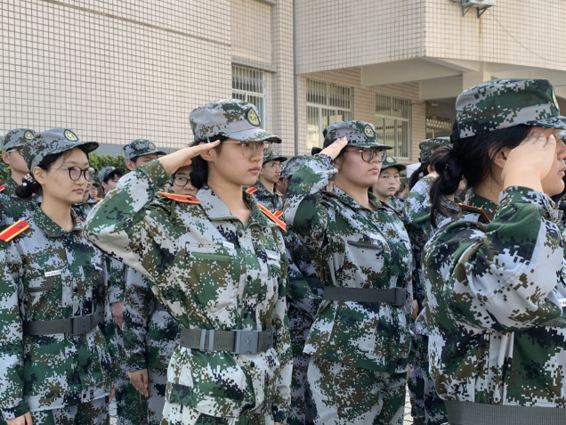 在同学们军姿站立标准后,教官开始了新的训练任务——敬礼。教官规范且详细的向同学们演示,并一列列、一位位依次指导,直至同学们能熟练掌握技巧。