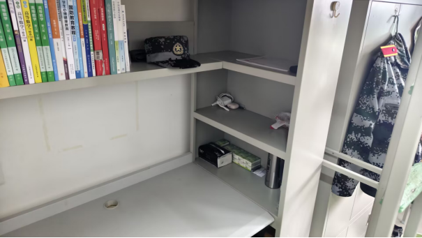 走进宿舍,仿佛步入了一方秩序井然的小天地。床铺之上,军被叠得棱角分明,如同一座精致的“豆腐块”,每一道折痕都笔直清晰,尽显军人般的严谨。书架上,迷彩军帽摆放得端端正正,帽徽在光线下熠熠生辉;旁边的书本整齐排列,学生手册立得笔直,与一旁规整的物品相映成趣。整个内务环境整洁划一,每一处细节都透露出同学在军训中练就的自律与细致,将军人作风的严谨与规范,融入了日常的生活角落。