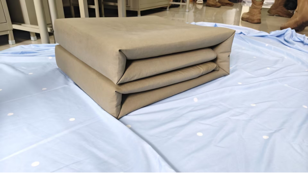 同学将这床被子被叠得方方正正,宛如一块精心雕琢的豆腐,棱角分明,线条笔直。每一处褶皱都被抚平,每一个边角都被掖得服服帖帖,浅棕色的被面整洁无皱,在浅蓝色带白点的床单映衬下,透着一股严谨规整的气息,尽显一丝不苟的整洁感。