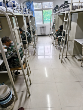 因突如其来的降雨,军训训练计划临时调整。各连队新生在教官指导下,于宿舍内进行了高标准的内务整理,不似昨天的踟蹰,得到教官真传的同学们很快整理完毕。结束后,同学们并未松懈,而是在等待教官检查的间隙,自发预习起大学课程,展现出新一届学子自律向学的良好风貌。